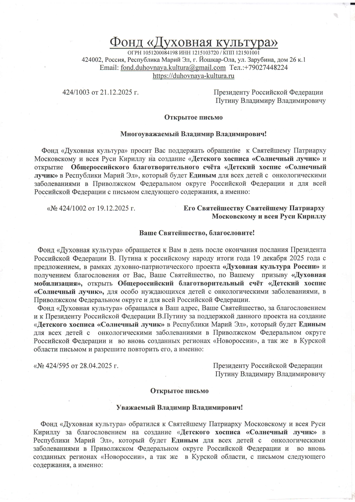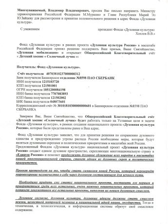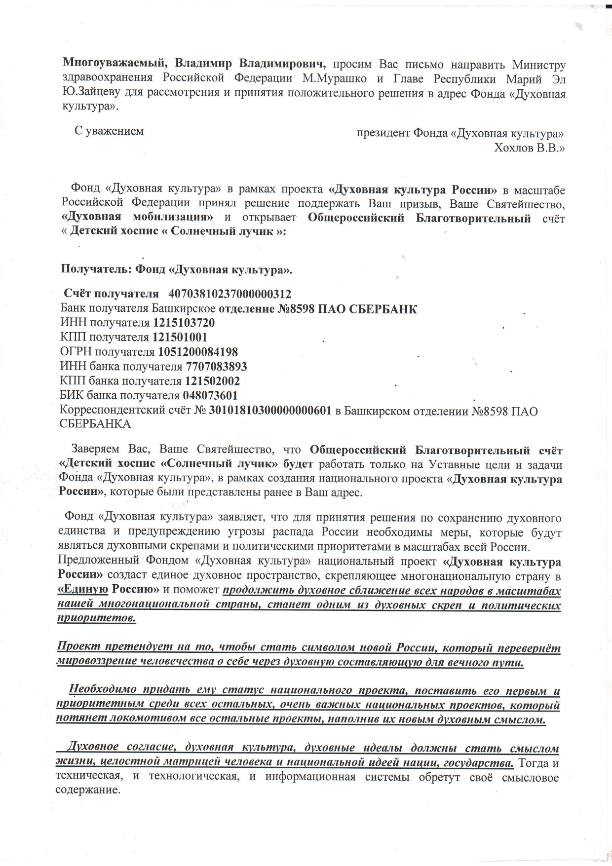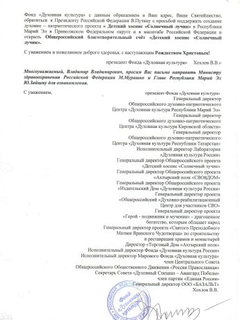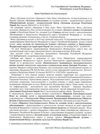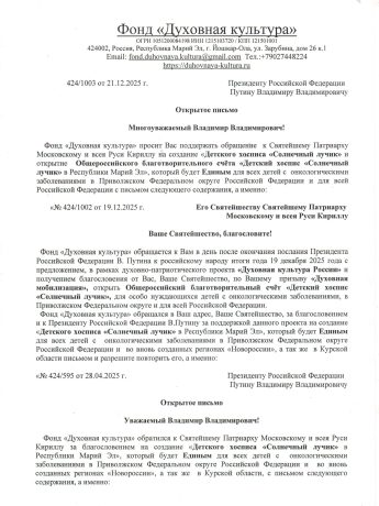 Фонд «Духовная культура» принял решение поддержать призыв Святейшего Патриарха Московского и всея Руси Кирилла «Духовная мобилизация» и построить Детский хоспис «Солнечный лучик» для тяжелобольных детей с онкологическими заболеваниями в Российской Федерации и всего ближнего зарубежья в Республике Марий Эл и открывает ОбщероссийскийБлаготворительный счёт «Детский хоспис «Солнечный лучик», согласованный с ПрезидентомРоссийской Федерации В.Путиным.