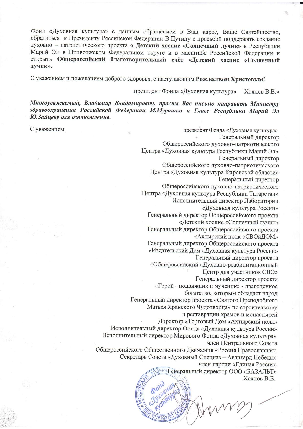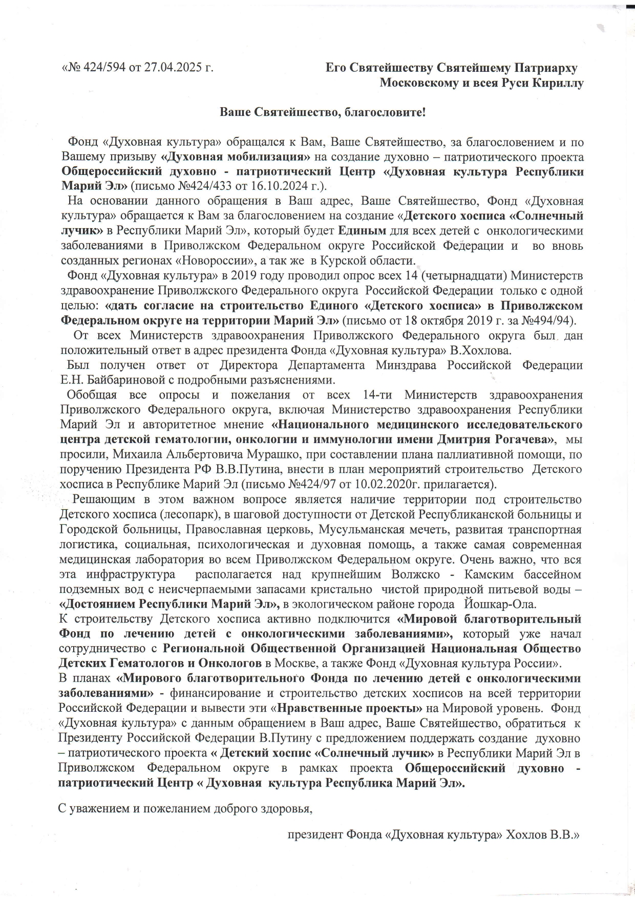 Фонд «Духовная культура» в 2019 году проводил опрос всех 14 Министерств здравоохранение Приволжского Федерального округа Российской Федерации только с одной целью: «дать согласие на строительство Единого «Детского хосписа» в Приволжском Федеральном округе на территории Марий Эл» (письмо от 18 октября 2019 г. за №494/94 на сайте). От всех Министерств здравоохранения Приволжского Федерального округа был дан положительный ответ в адрес президента Фонда «Духовная культура» В.Хохлова, а так же был получен ответ от Директора Департамента Минздрава Российской Федерации Е.Н.Байбариновой с подробными разъяснениями. Обобщая все опросы и пожелания от всех 14 Министерств здравоохранения Приволжского Федерального округа, включая Министерство здравоохранения Республики Марий Эл и авторитетное мнение «Национального медицинского исследовательского центра детской гематологии, онкологии и иммунологии имени Дмитрия Рогачева», Фонд «Духовная культура» просил Михаила Альбертовича Мурашко, при составлении плана паллиативной помощи, по поручению Президента РФ В.В.Путина, внести в план мероприятий строительство Детского хосписа в Республике Марий Эл (письмо №424/97 от 10.02.2020г.). Решающим в этом важном вопросе является наличие территории под строительство Детского хосписа (лесопарк), в шаговой доступности от Детской Республиканской больницы и Городской больницы, Православная церковь, Мусульманская мечеть, развитая транспортная логистика, социальная, психологическая и духовная помощь, а также самая современная медицинская лаборатория во всем Приволжском Федеральном округе. Очень важно, что вся эта инфраструктура располагается над крупнейшим Волжско — Камским бассейном подземных вод с неисчерпаемыми запасами кристально чистой природной питьевой воды – «Достоянием Республики Марий Эл», в экологическом районе города Йошкар-Ола. Фонд «Духовная культура» планирует финансирование и строительство детских хосписов на всей территории Российской Федерации, чтобы вывести эти «Нравственные проекты» на Мировой уровень.